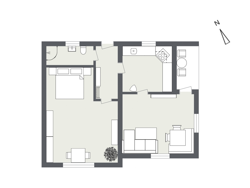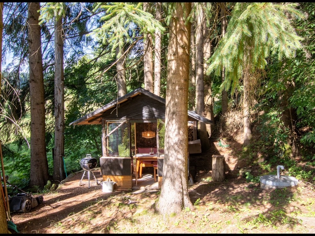 Im Haupthaus befinden sich ein großzügies Schlafzimmer, ein Wohnzimmer, Küche sowie Bad mit WC. Das Nebengebäude bietet weiteren Wohnraum mit Schlafzimmer und Vorraum – ideal für Gäste, Familie oder als persönlicher Rückzugsbereich. Eine Terrasse verbindet das Wohnen mit der umliegenden Natur.