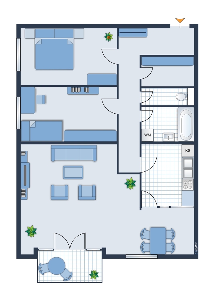 Zwei nach Westen ausgerichtete Schlafzimmer, Wohnzimmer und Küche offen Richtung Süden.