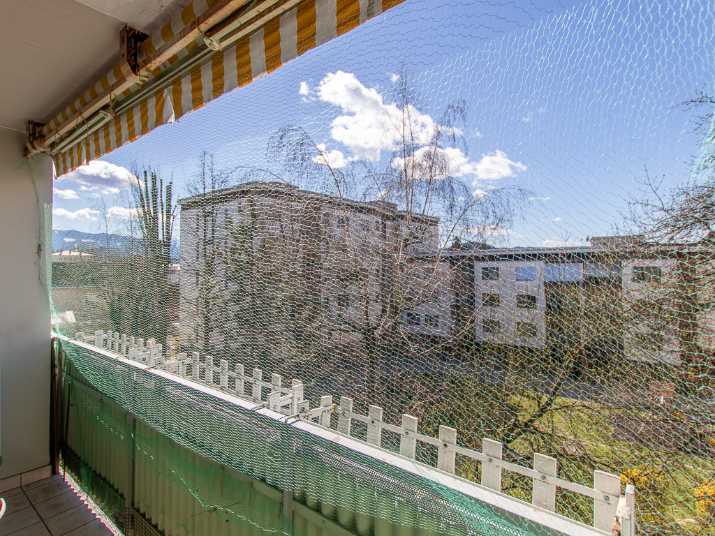 Durch den Blick in den Innenhof ist die Loggia schön ruhig und über den Dächern gegenüber ragen die Karawanken empor.
