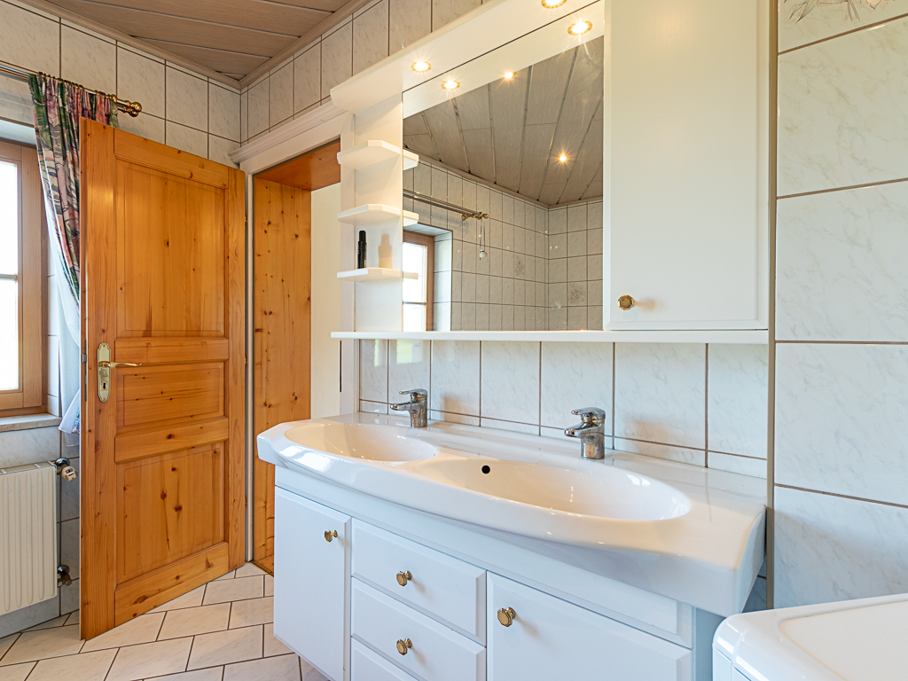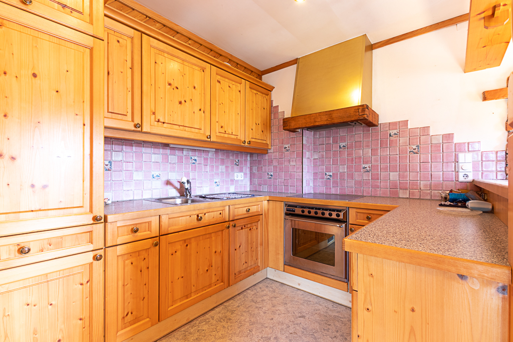 Eine Ebene darüber, im Obergeschoss, befindet sich eine freundliche Wohnung mit Schlafzimmer neben einem sehr großen und komfortablen Badezimmer, ein helles Wohnzimmer und ein Koch/Esszimmer mit Terrassenzugang - die Terrasse ist allerdings noch ohne Belag. Die Wohnräume sind mit Lärchenschiffboden ausgestattet, das Badezimmer ist komplett bis an die Decke verfließt.