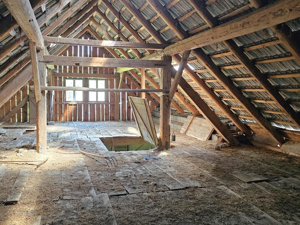 Im Obergeschoß ist alles eine freie Ebene und kann je nach Bedarf eingeteilt werden. Haben Sie genug Fantasie, sich dazu Gedanken zu machen?