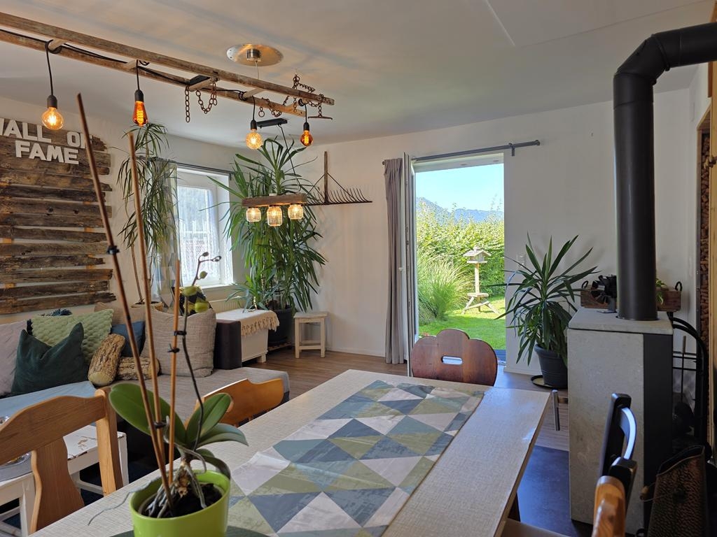 Der große Garten lädt zum Träumen, Gärtnern oder einfach zum Genießen der Stille ein. Freundliche Nachbarn und die Höhenlage von rund 900 Metern in Bad Bleiberg schenken Ihnen ein Leben in frischer Bergluft – mit der Natur als täglichem Begleiter.