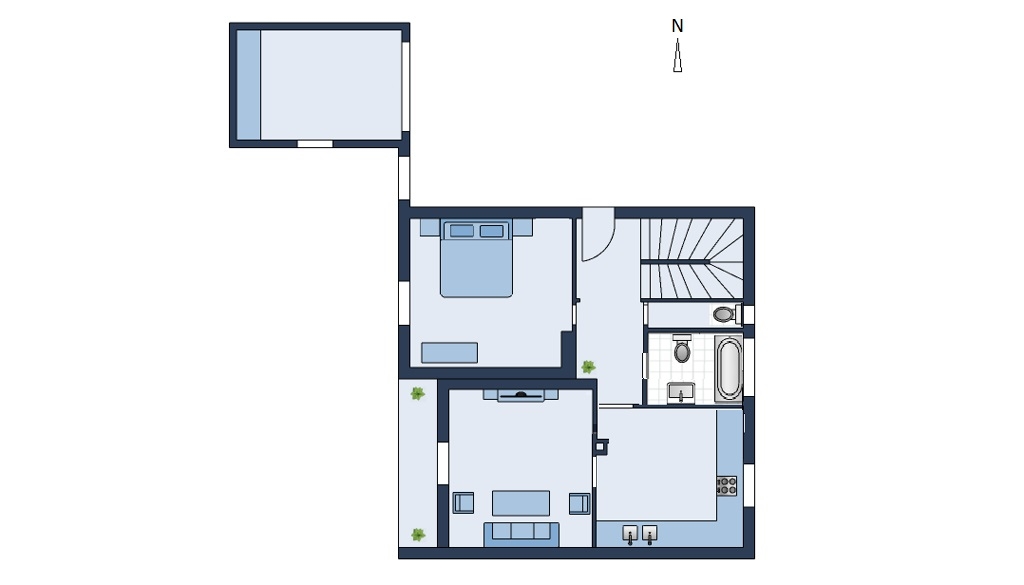 Auf dem ca. 500 m² großen Grundstück befindet sich das Wohnhaus mit 2 getrennten, aber identen Wohn-Einheiten in 2 Etagen mit jeweils ca. 60 m² bestehend aus Küche, Bad, WC extra und 2 Zimmern. Im Parterre tritt man vor dem SW-Zimmer auf eine Terrasse, die in den grünen Garten führt, im OG darüber auf einen Balkon.