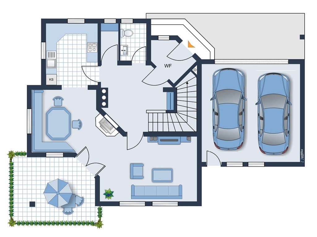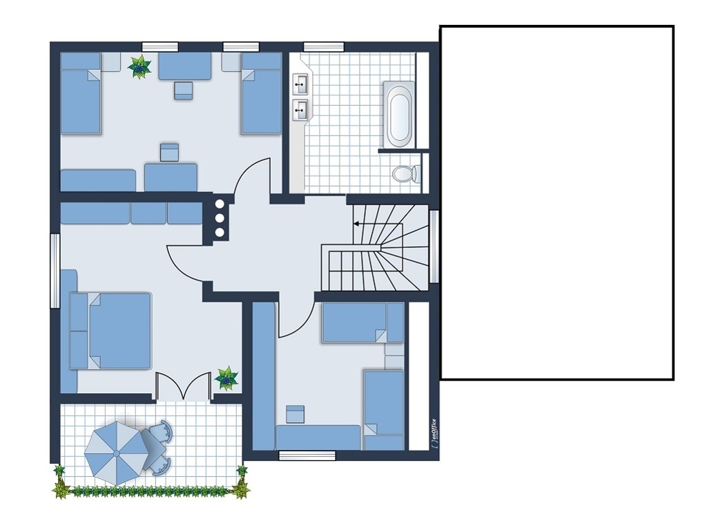 Die Böden sind im Erdgeschoss Parkett und Fliese, im Obergeschoss auch Teppich.