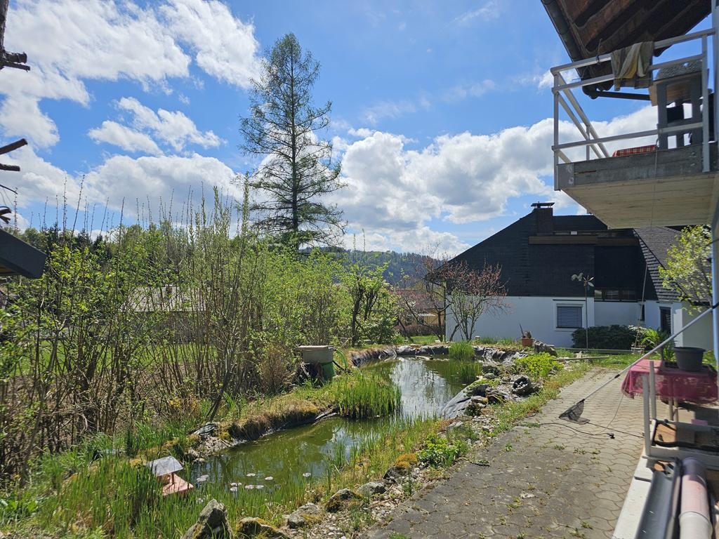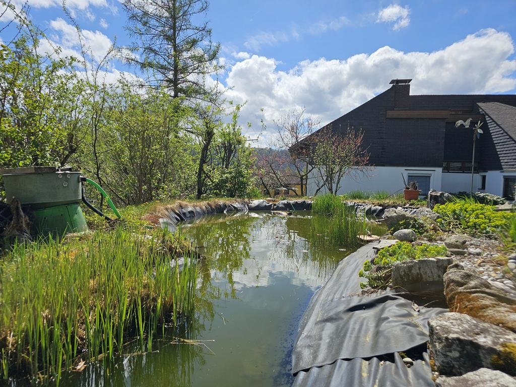 Der sonnige Garten mit Fischteich und großzügiger Terrasse gibt den Blick über die umliegende Landschaft frei und Sie können die Aussicht den ganzen Tag genießen – ganz gleich, ob beim Frühstück im Freien oder einem entspannten Abend mit Familie und Freunden.