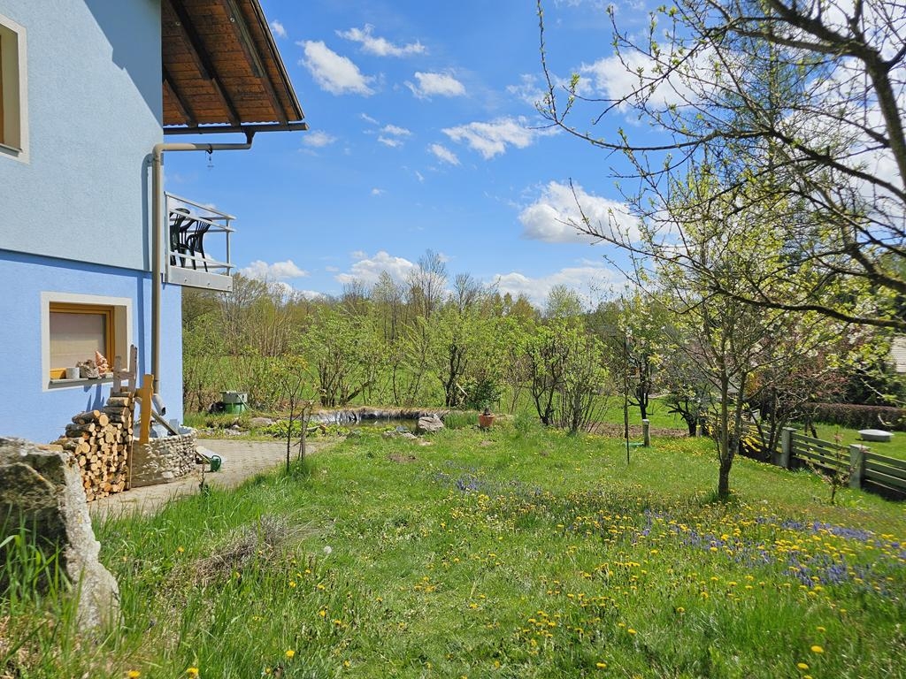 Der sonnige Garten mit Fischteich und großzügiger Terrasse gibt den Blick über die umliegende Landschaft frei und Sie können die Aussicht den ganzen Tag genießen – ganz gleich, ob beim Frühstück im Freien oder einem entspannten Abend mit Familie und Freunden.