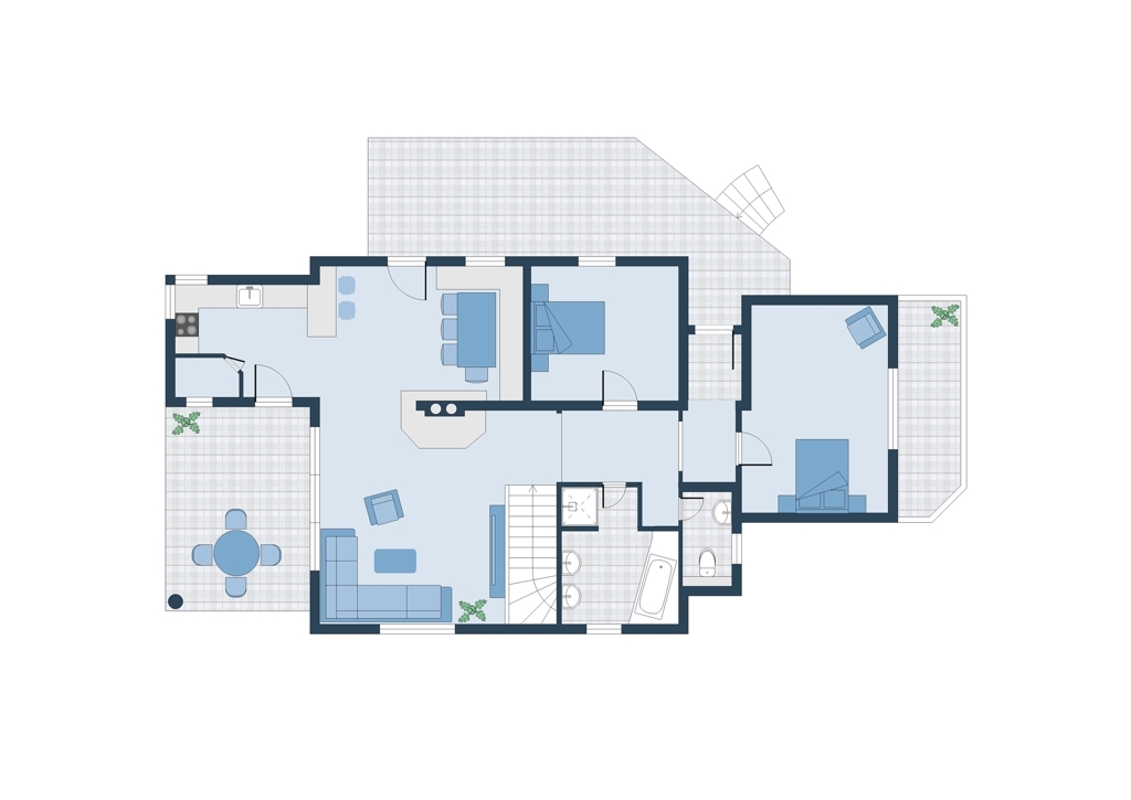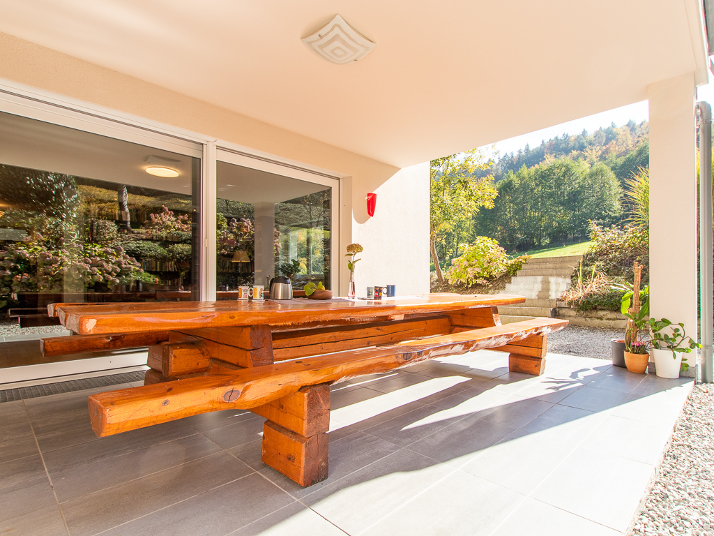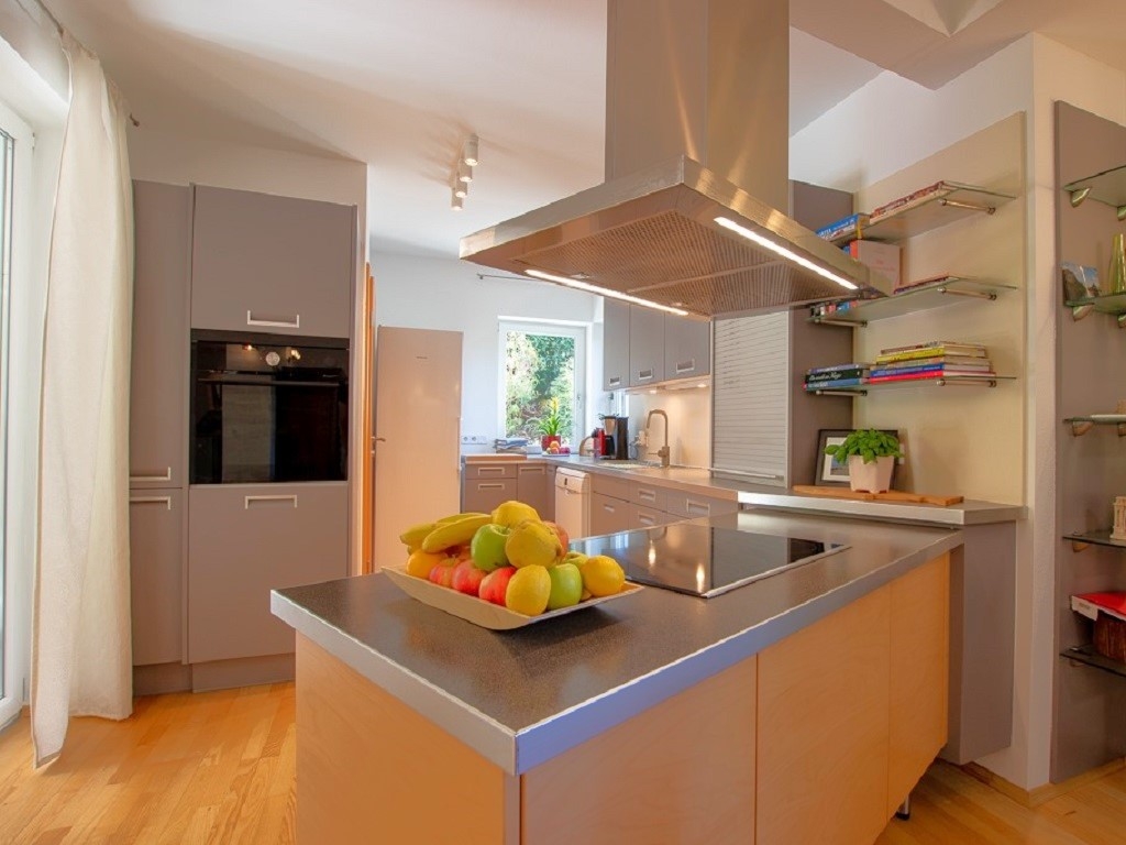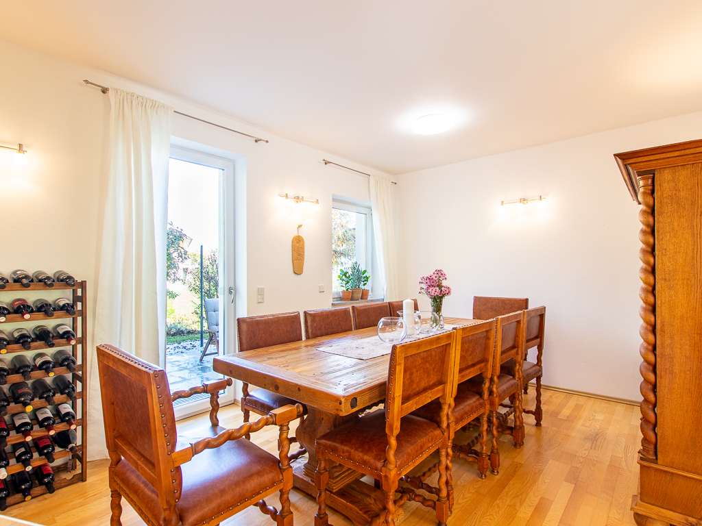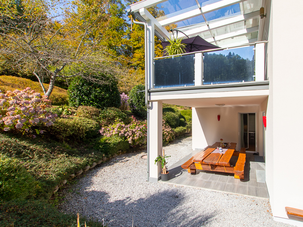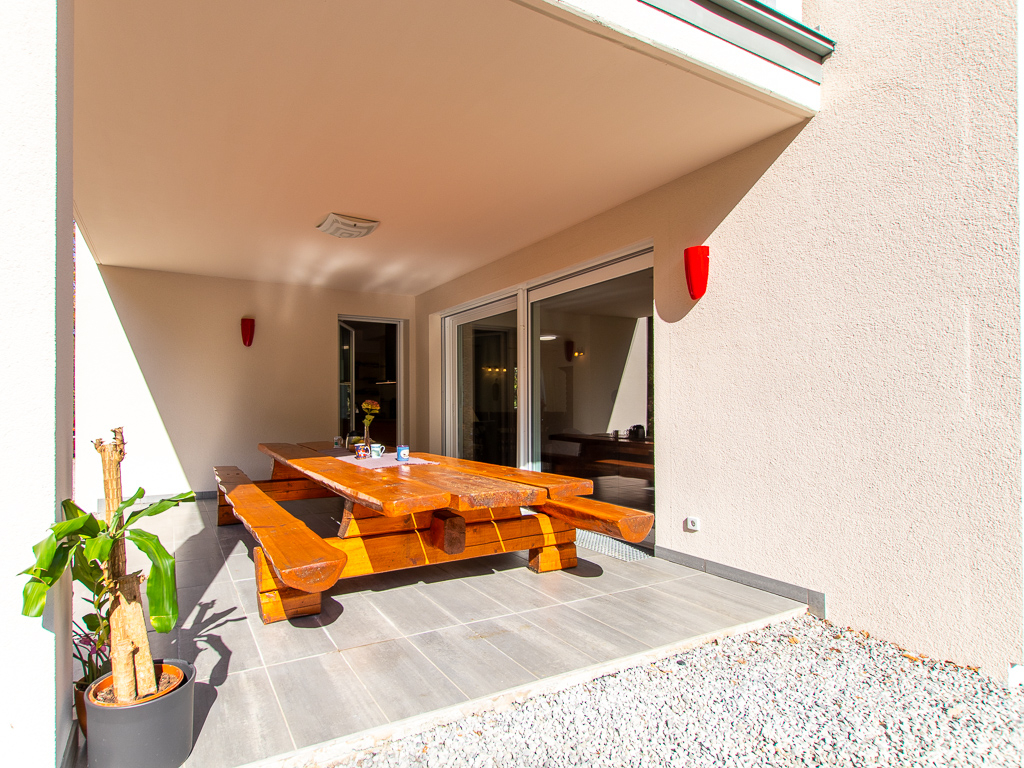 Aber das ist nicht alles: Diese Wohnung bietet nicht nur den naturnahen Garten, sondern auch eine überdachte Terrasse mit einem urigen Tisch im Wikinker-Stil, eine weitere Terrasse im Norden für die heißen Tage und einen Balkon im Osten des Schlafzimmers - für die Morgensonne. Der Tisch auf der Süd-Terrasse wurde nach alter 1.000-jähriger Wikinger-Tradition gebaut und kommt direkt aus Norwegen.