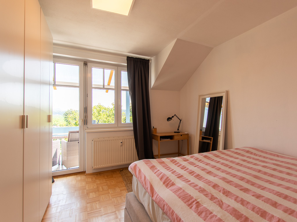 Das Schlafzimmer ist geräumig und bietet genügend Platz für ein komfortables Doppelbett sowie einen Kleiderschrank. Das große Fenster und die Balkontür ermöglichen einen schönen Blick auf die Umgebung und lassen viel Tageslicht herein. Es ist ein perfekter Rückzugsort, um sich nach einem langen Tag zu entspannen.