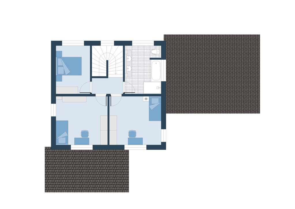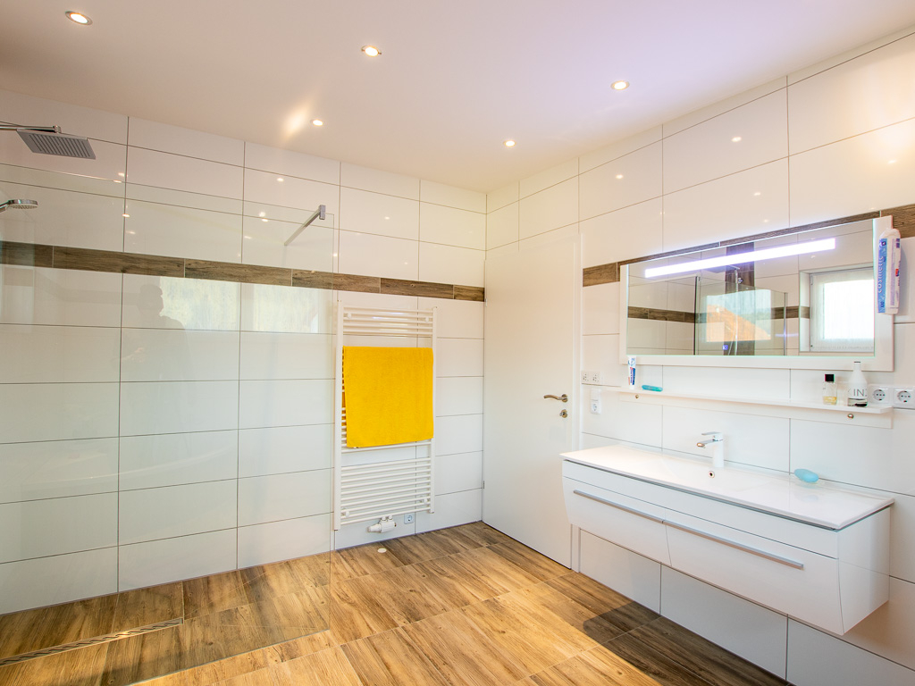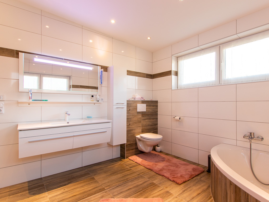 Im Obergeschoß präsentiert sich ein beeindruckendes Badezimmer mit einer geräumigen Eckwanne und einer luxuriösen Walk-in-Dusche. Zwei geräumige Zimmer sind nach Süden ausgerichtet und ein separates Büro nach Westen.