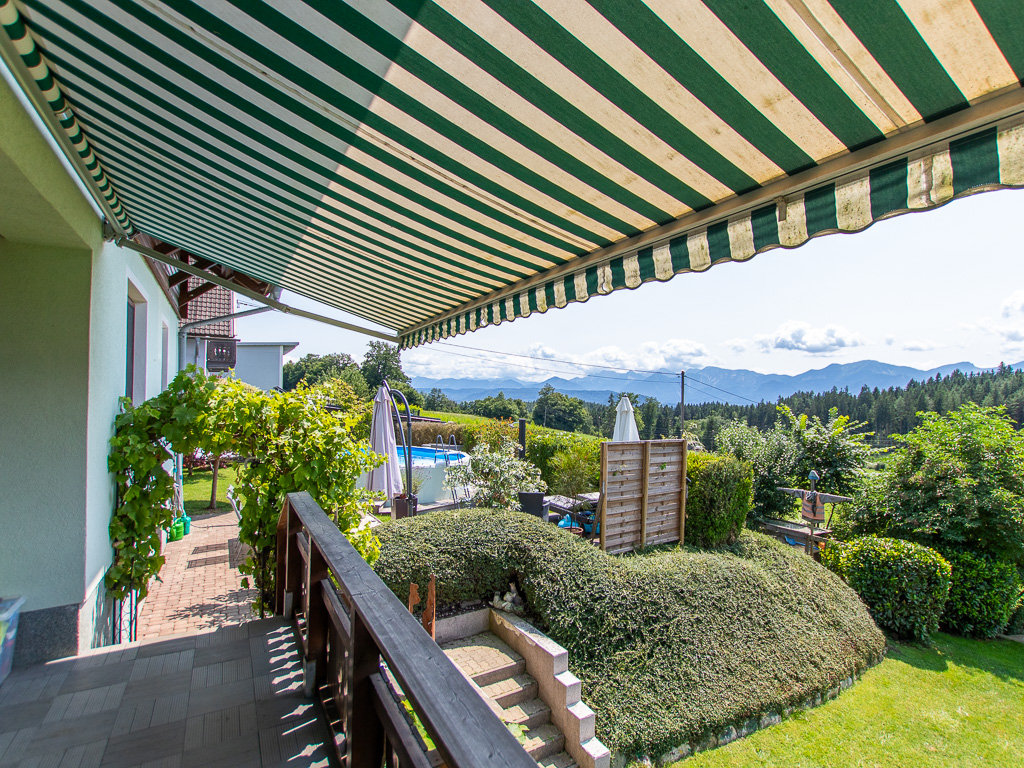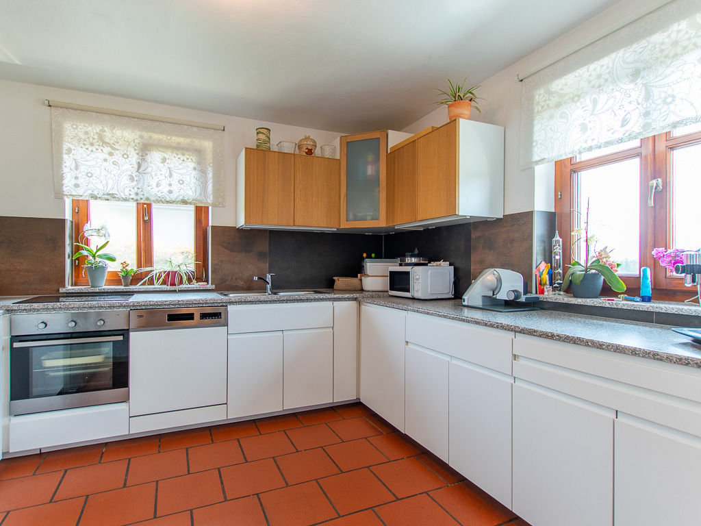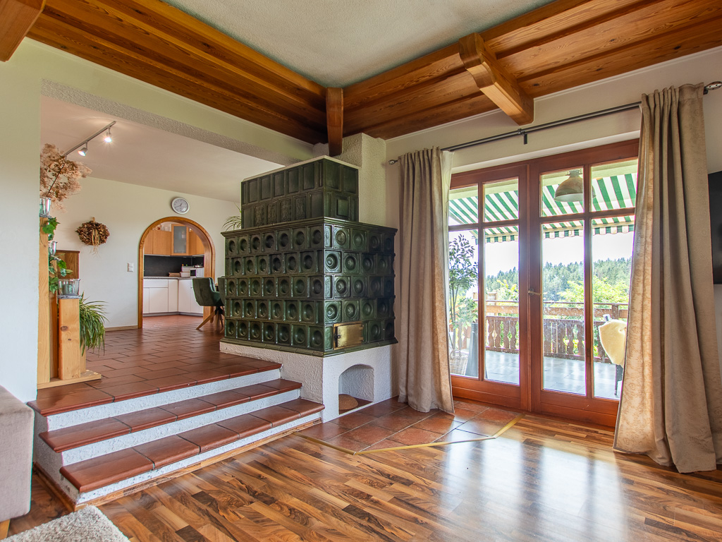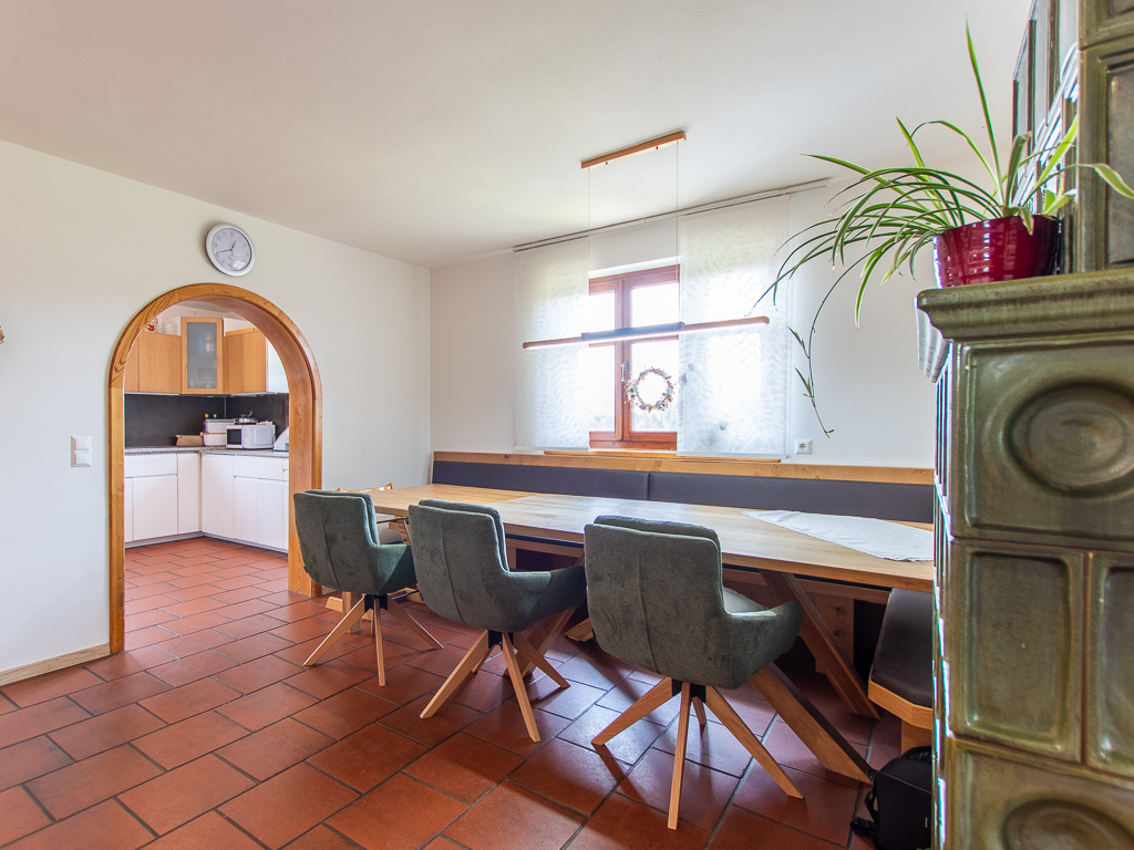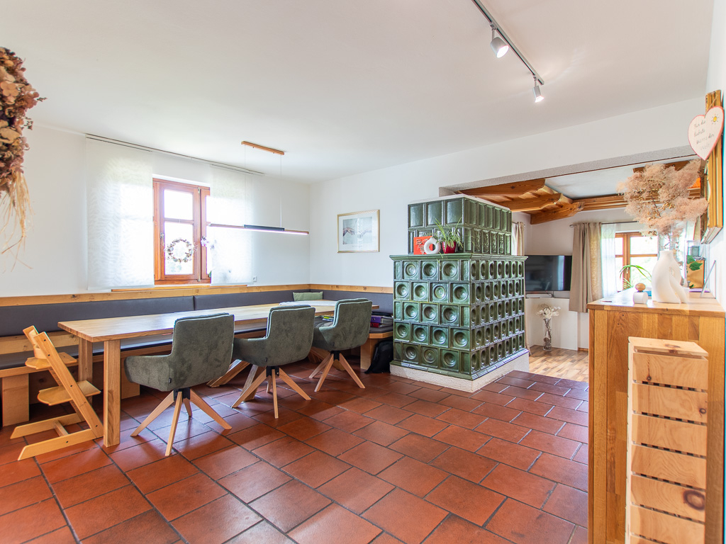 EG: Eingangsbereich, offene Küche mit gemütlicher Essecke, Wohnzimmer mit Kachelofen und Ausgang zur Terrasse, Bad, WC