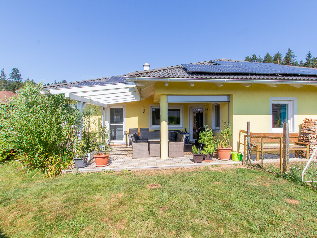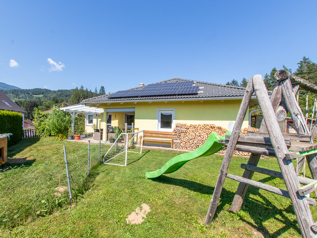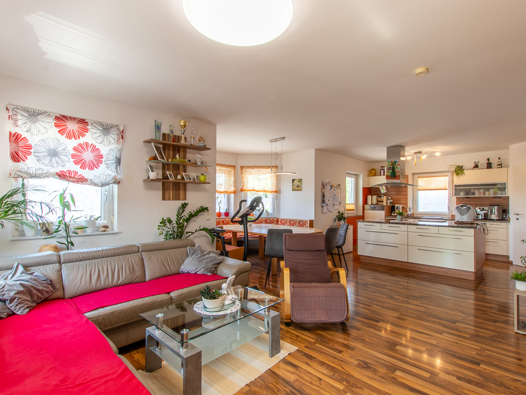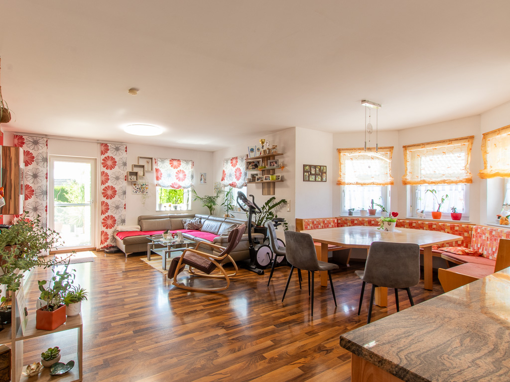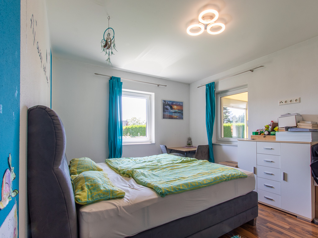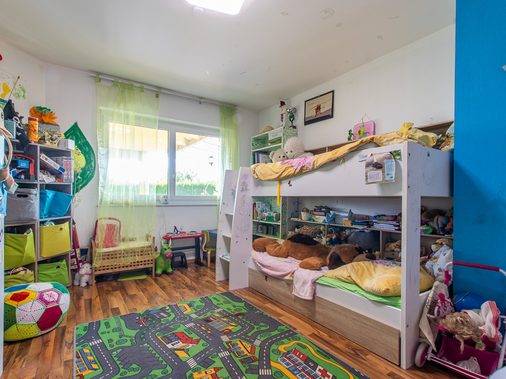 Diele, offene Küche mit Essecke und Wohnbereich mit Zugang zur Terrasse, zwei Kinderzimmer, Elternschlafzimmer mit Schrankraum, Badezimmer.
