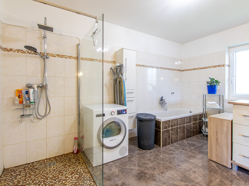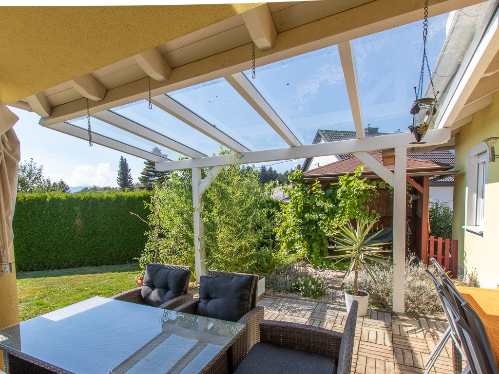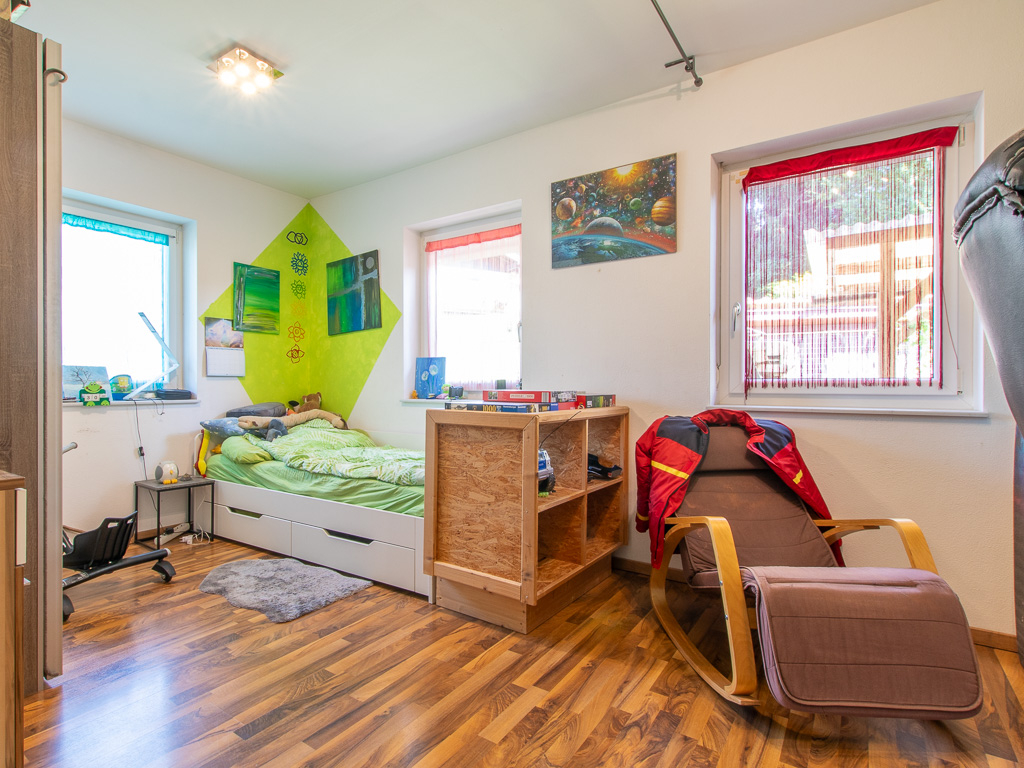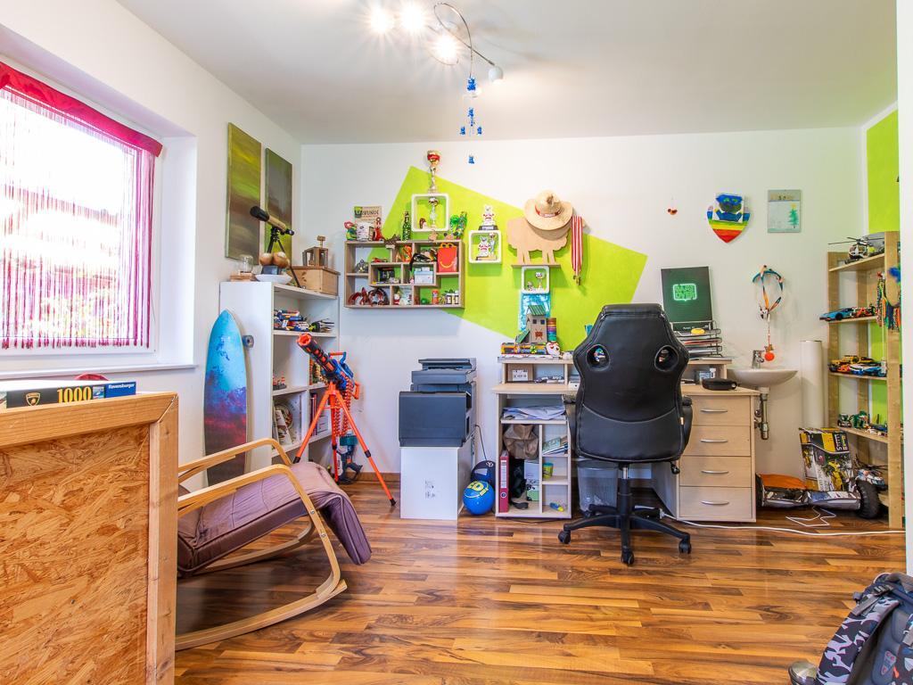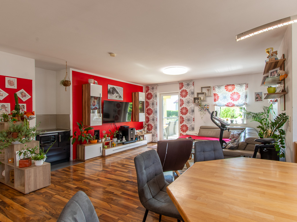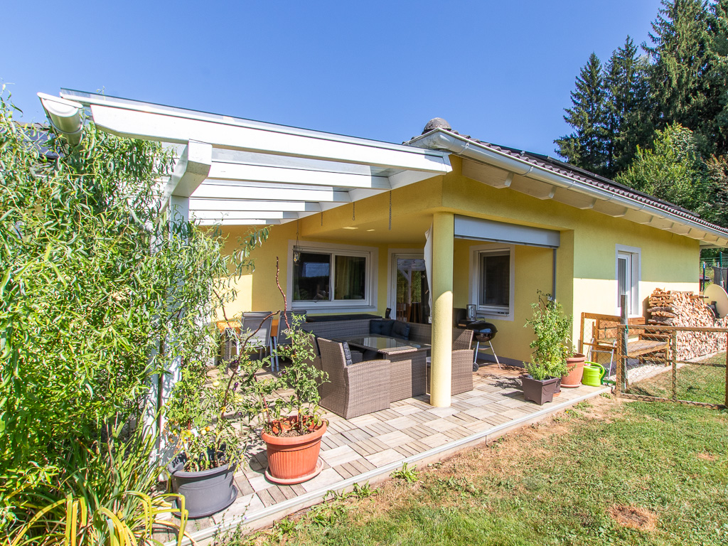 Diele, offene Küche mit Essecke und Wohnbereich mit Zugang zur Terrasse, zwei Kinderzimmer, Elternschlafzimmer mit Schrankraum, Badezimmer.