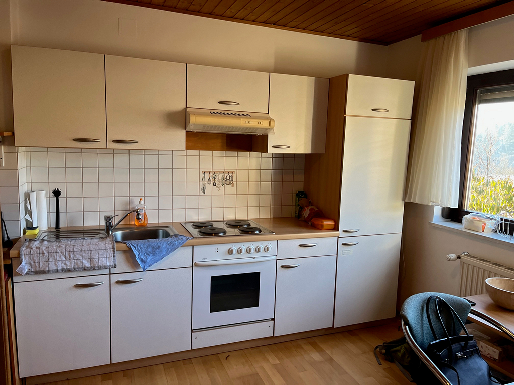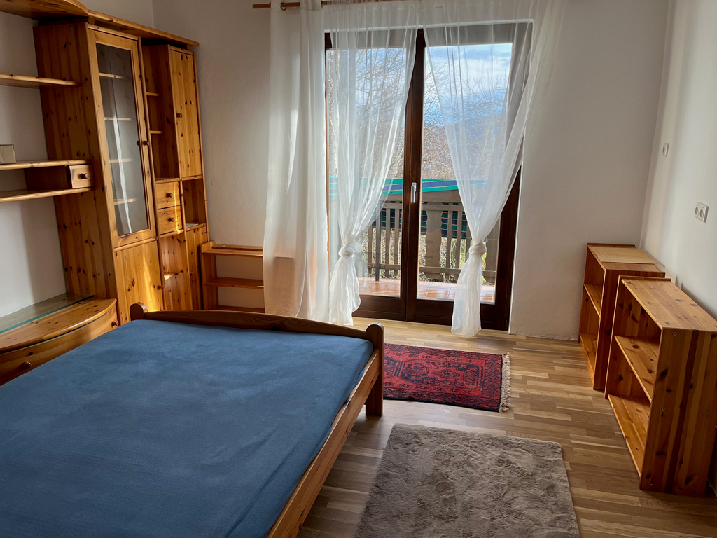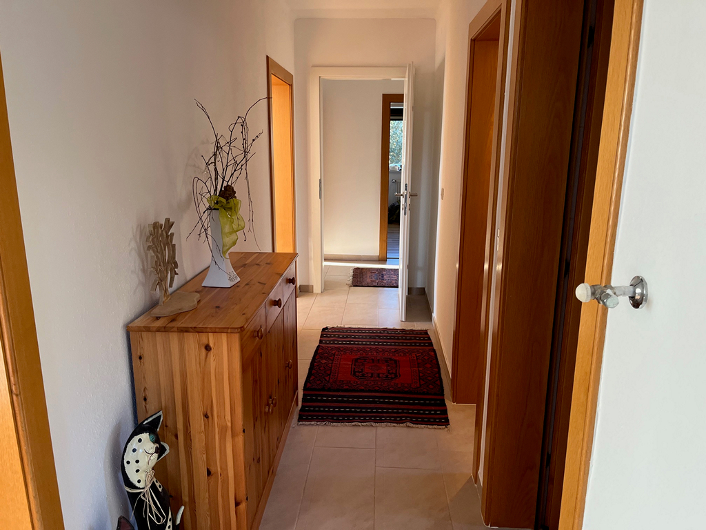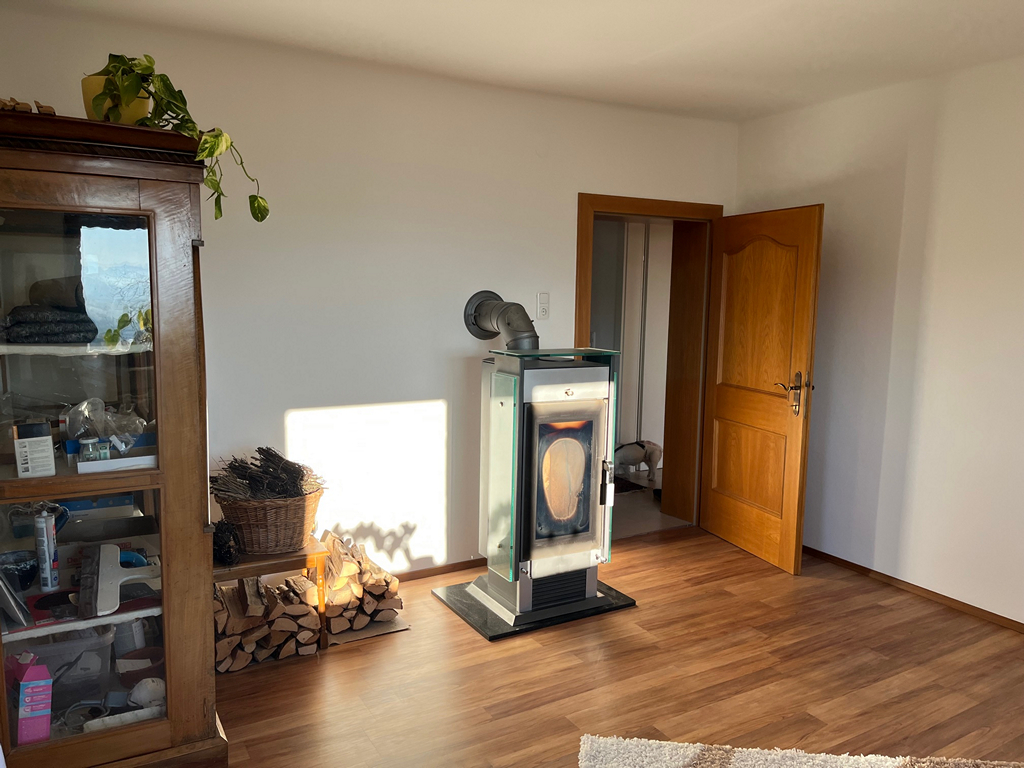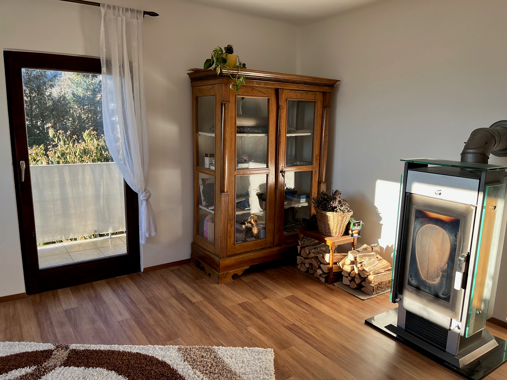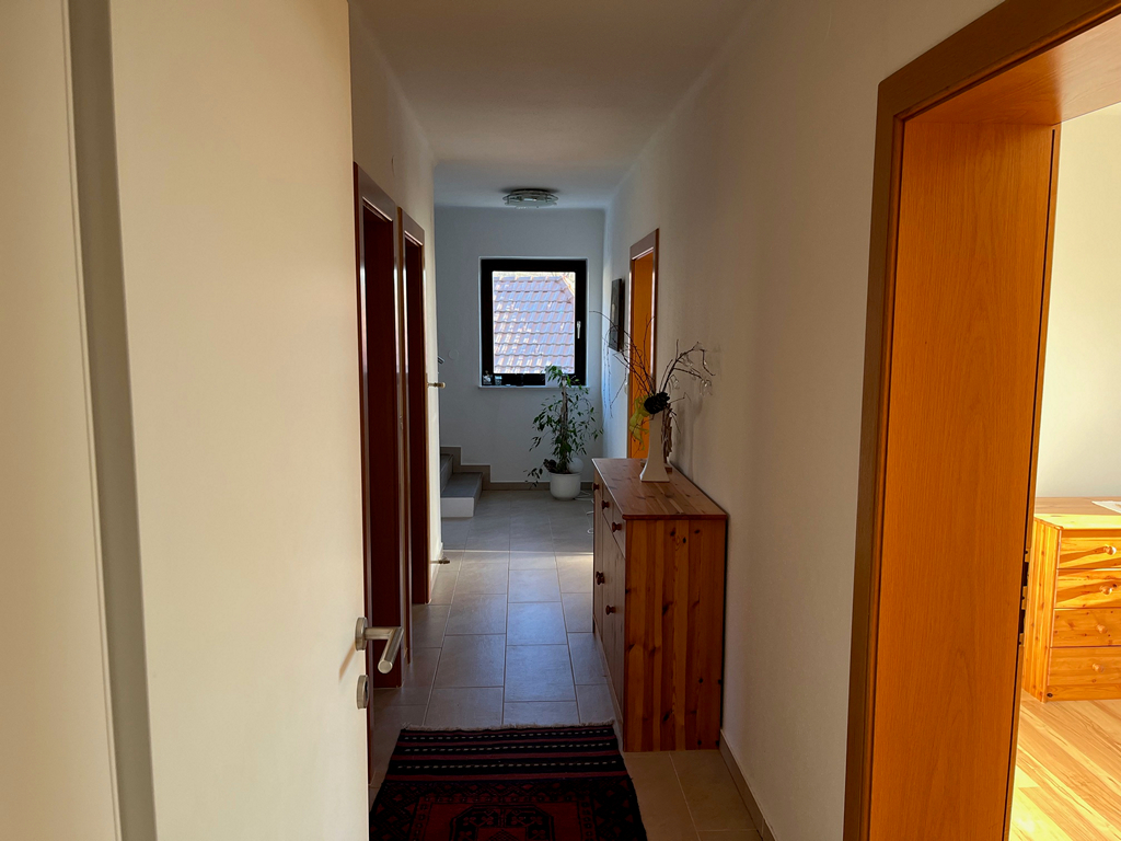 Diele, Küche mit Essecke, Wohnzimmer mit Kaminofen und Zugang zum Balkon, zwei neue Badezimmer, WC, zwei Schlafzimmer mit Balkon.
