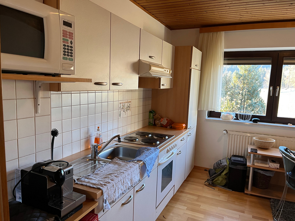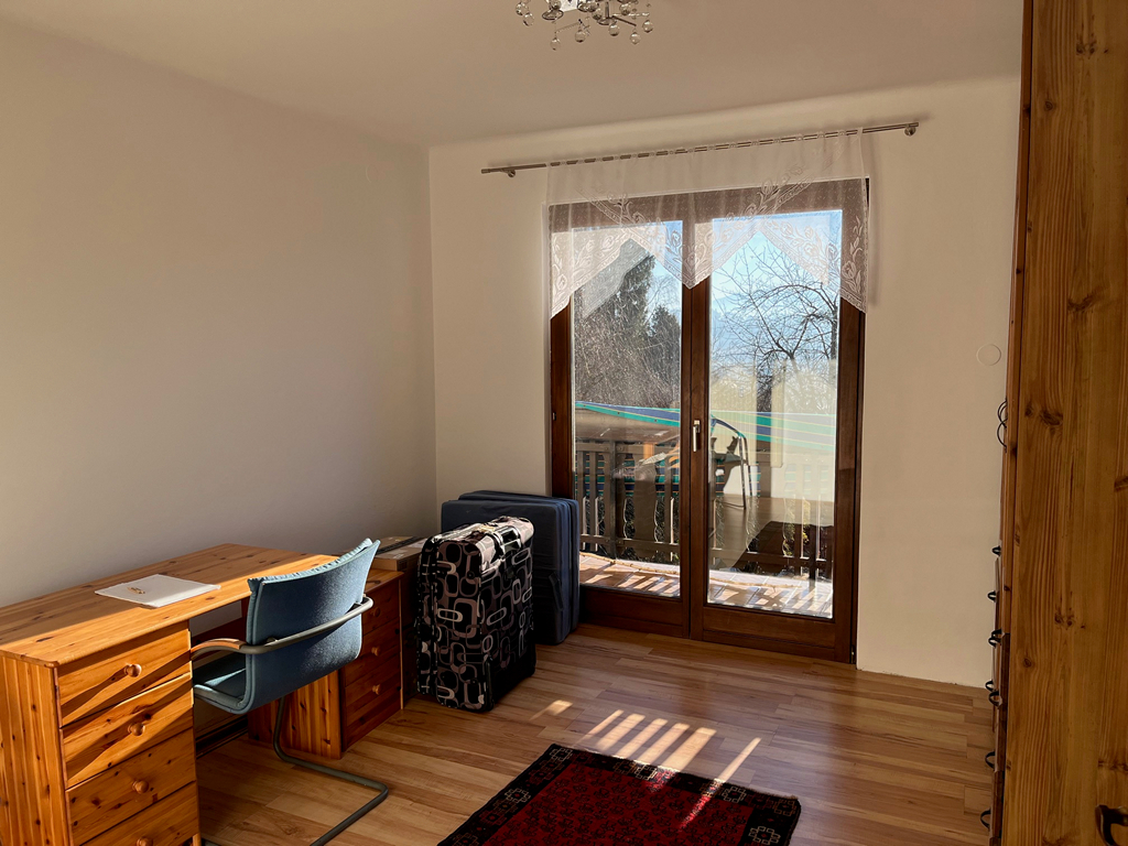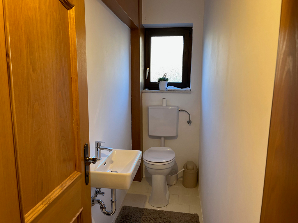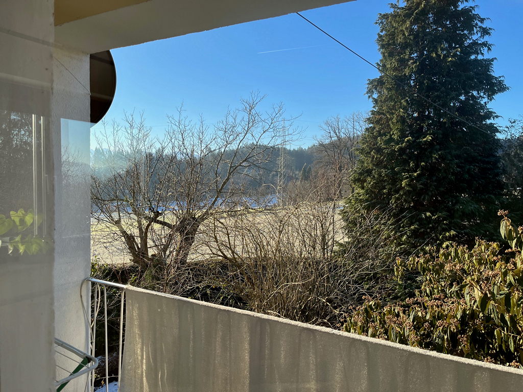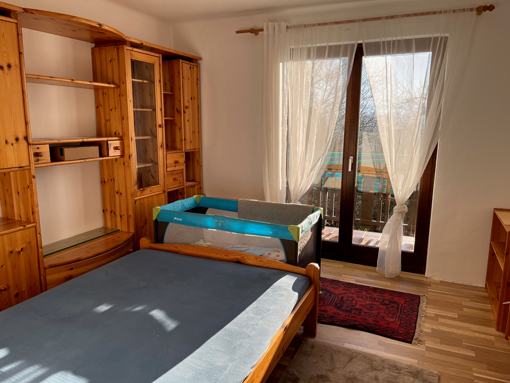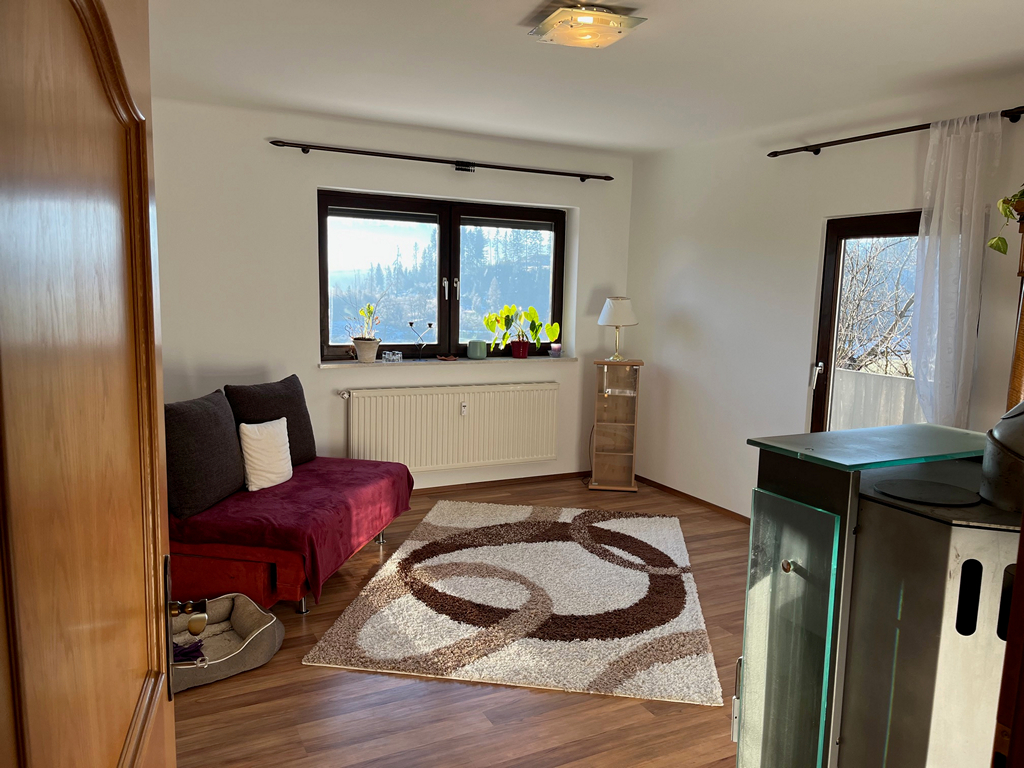 Diele, Küche mit Essecke, Wohnzimmer mit Kaminofen und Zugang zum Balkon, zwei neue Badezimmer, WC, zwei Schlafzimmer mit Balkon.