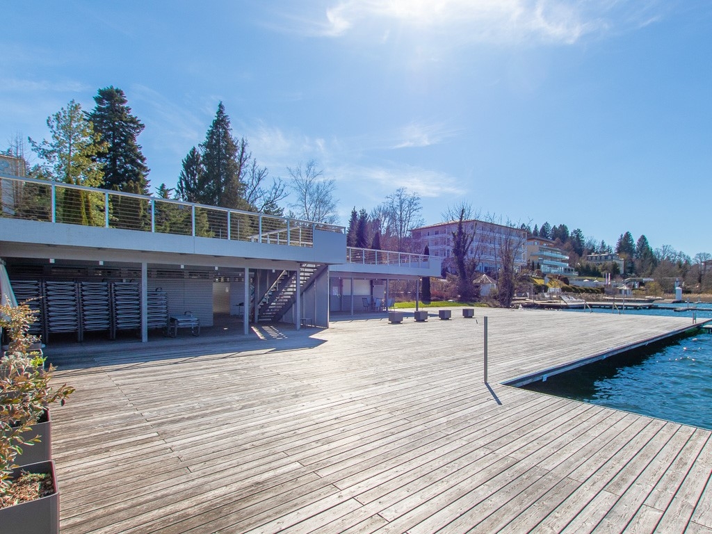 Der elegante Bau bietet großzügig ruhige Grünflächen, einen beheizten und servicierten Pool, eine Parkanlage und den Zugang zu einer XL-Steganlage direkt am See.