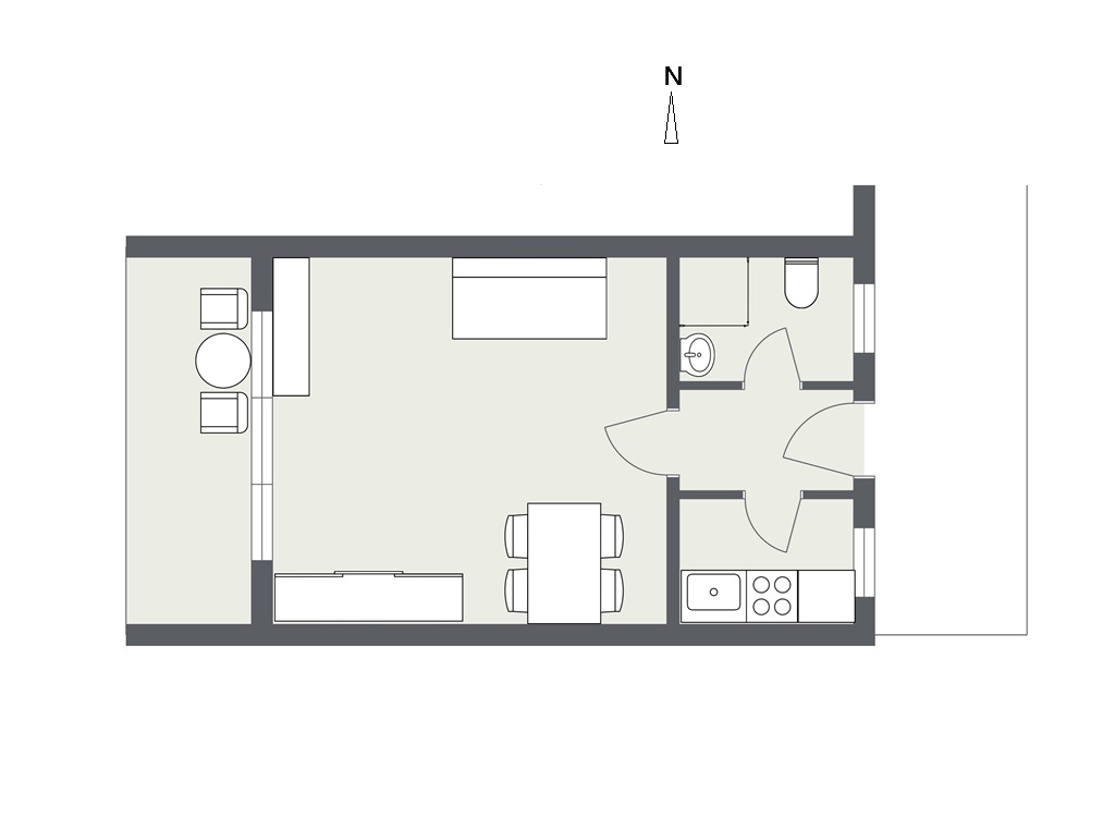 Die Wohnung besteht aus dem Wohn-Schlafzimmer mit Westbalkon, einer Küche, einem Bad und dem Empfangsbereich.