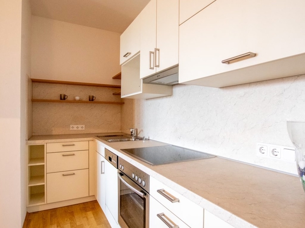 Parkettböden, Fliesen, Isolierglasfenster, Einbauküche, verglaste Loggia mit mehreren Fenstern zum Aufmachen.